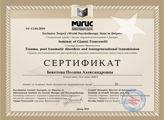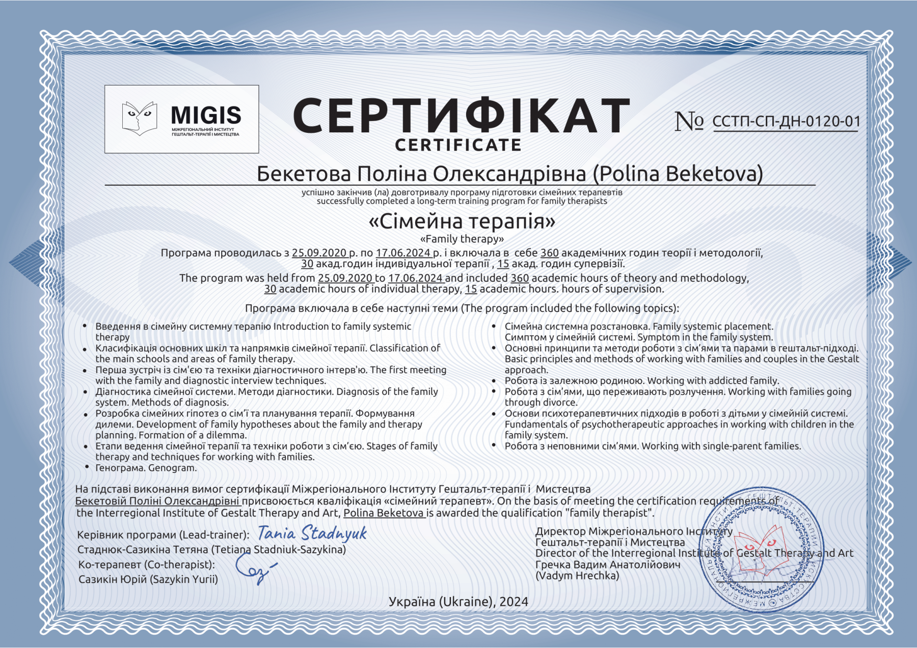 Psychologist | Gestalt therapist in certification process | Specializes in art therapy | Specializes in family systemic therapy