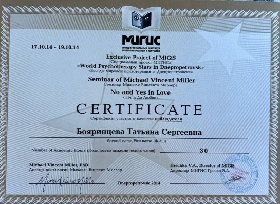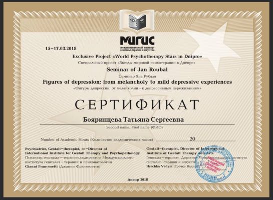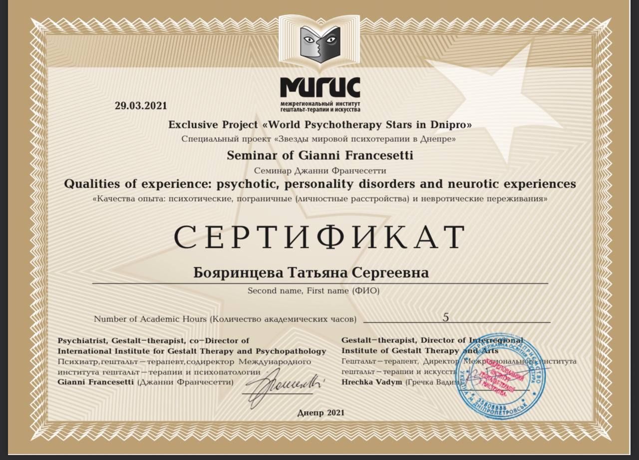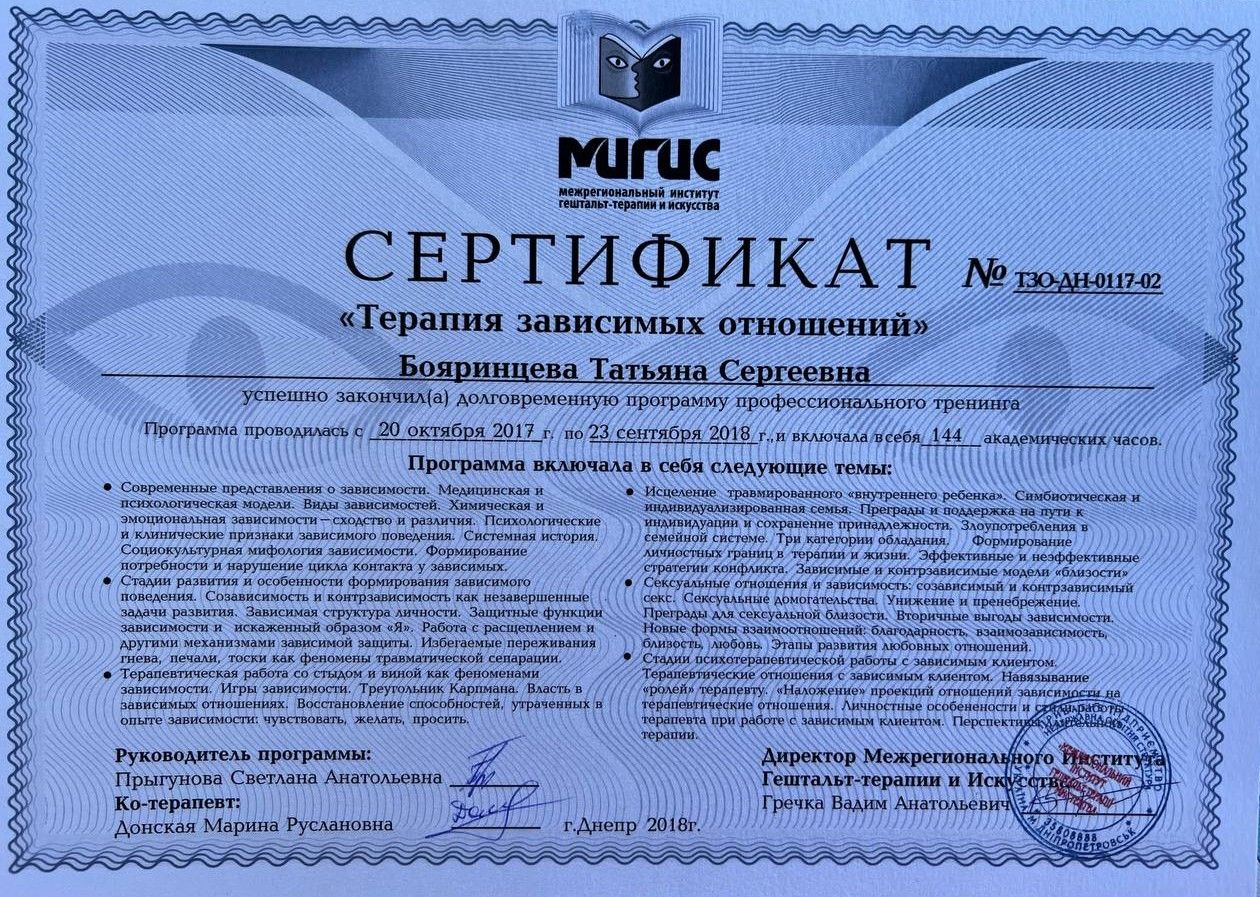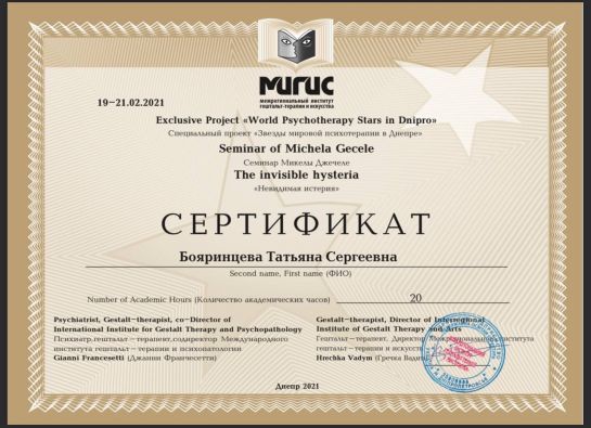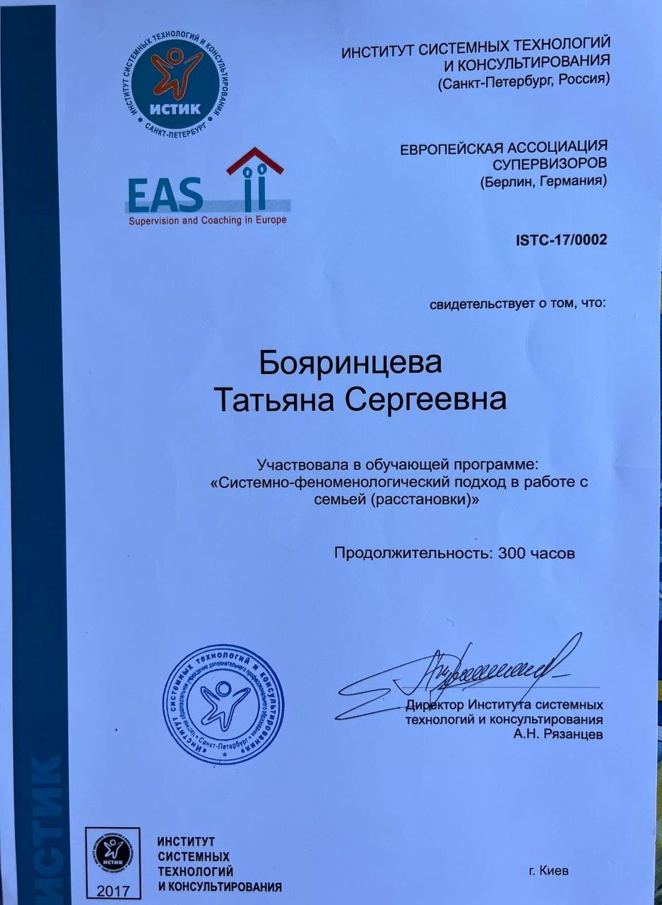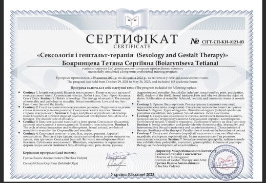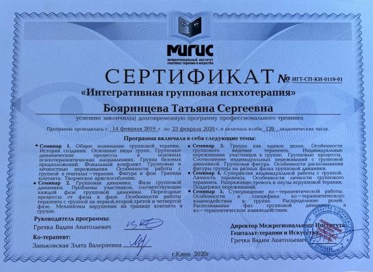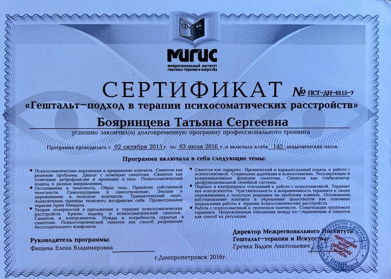 Psychologist | Gestalt therapist in training | Supervisor in training | Group therapist | Accredited MIGIS assistant | Specializes in working with couples and families | Specializes in psychosomatics | Specializes in emotional addictions | Specializes in sexuality issues | Specializes in eating disorders | Specializes in systemic constellations