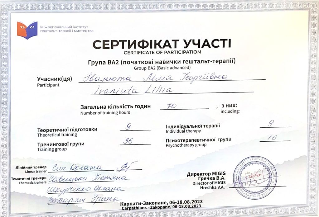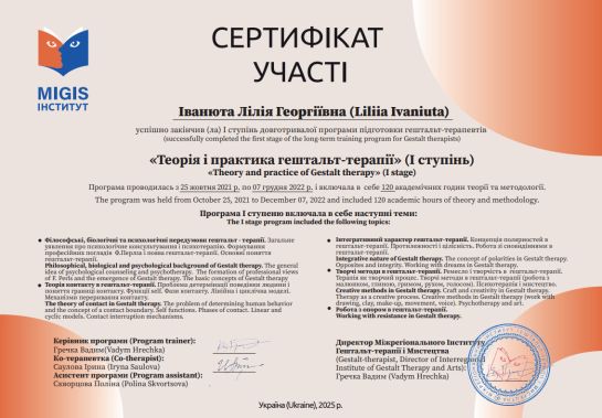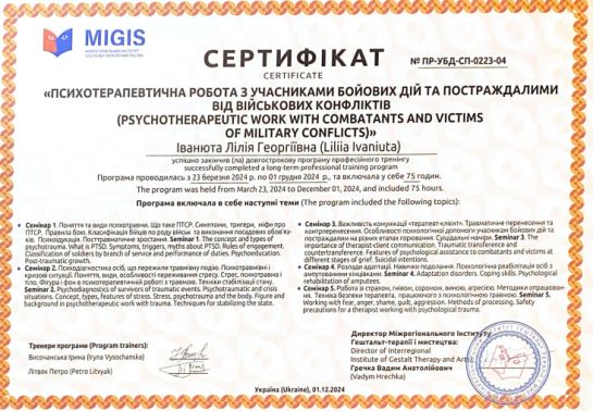Psychologist | Тraining Gestalt therapist | Specialises in psychotherapeutic work with combatants and victims of military conflicts, working with PTSD