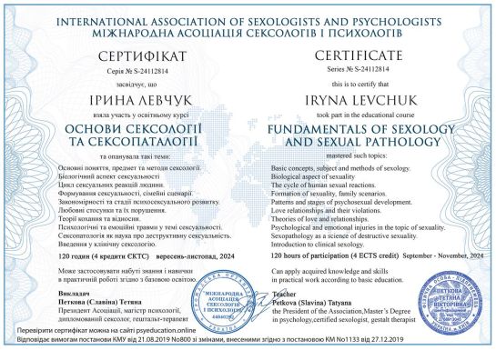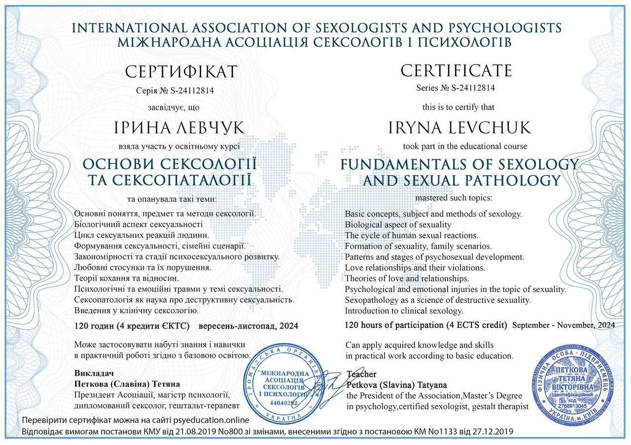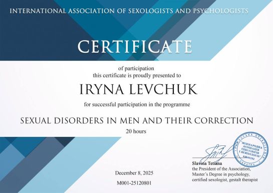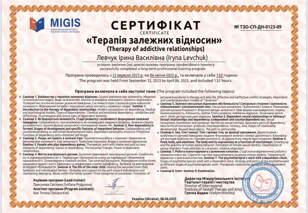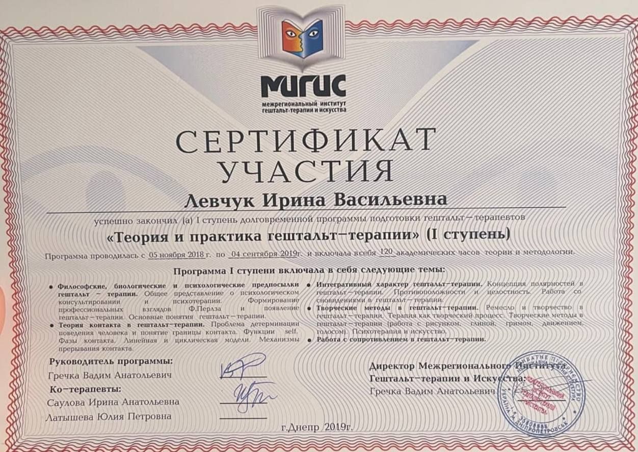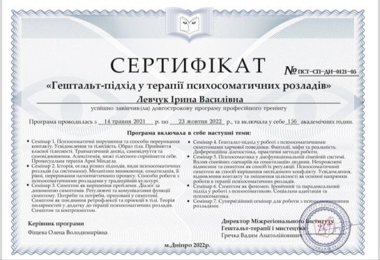 Psychologist | Gestalt therapist in certification process | Specializes in the Gestalt approach to therapy for psychosomatic disorders | Specializes in the basics of psychosomatics and body-oriented therapy |Specializes in therapy for codependent relationships | Specializes in sexuality issues