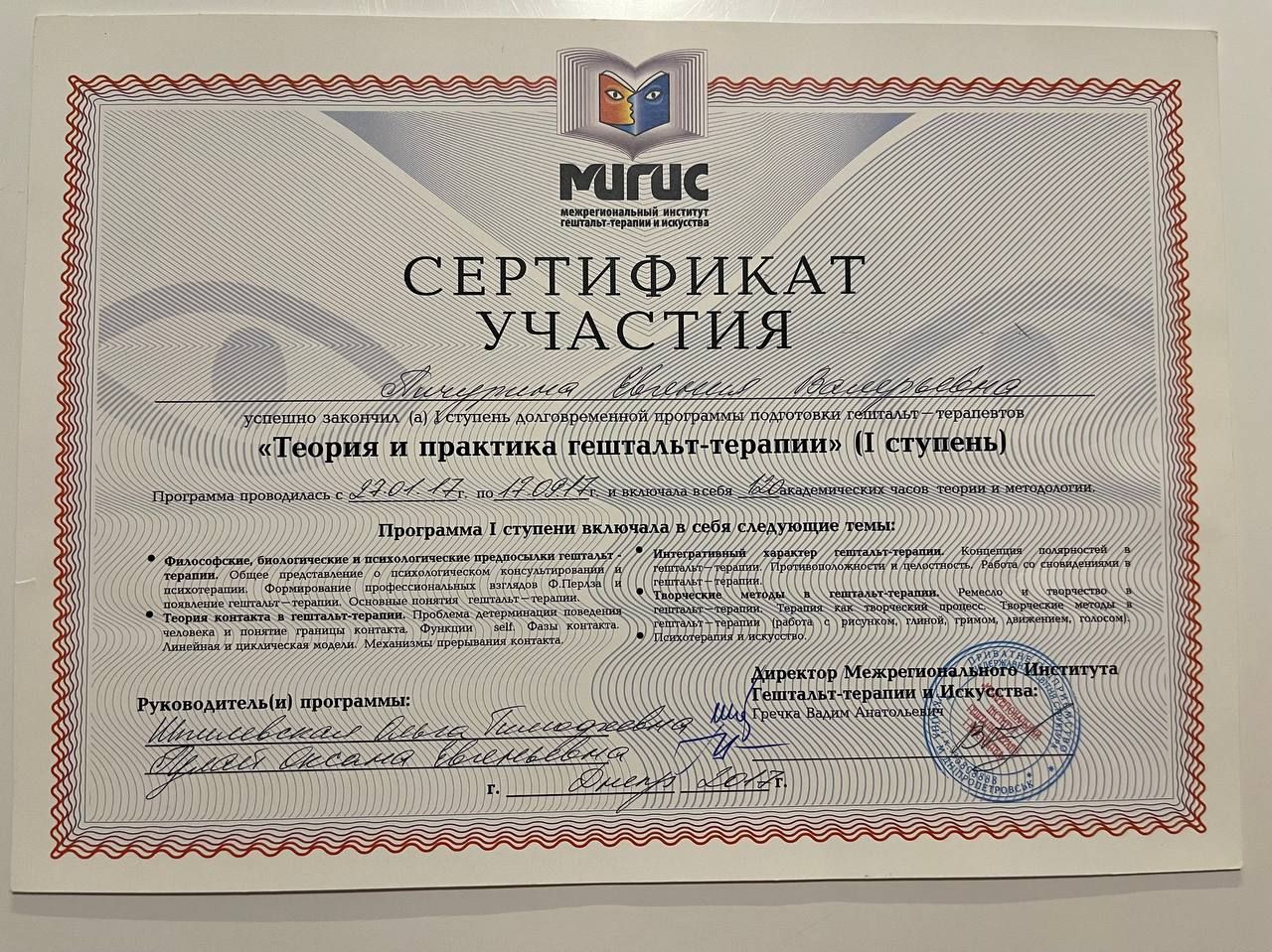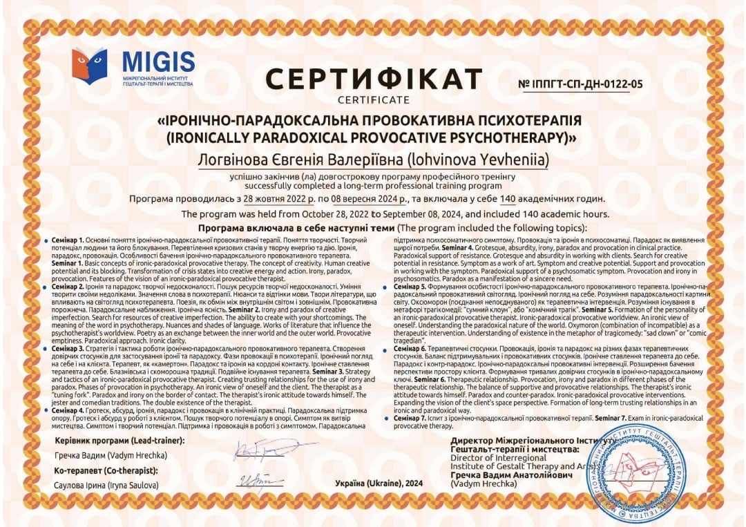 2022 - 2024 - Interregional Institute of Gestalt Therapy and Art (MIGIS), specialized program “Ironic-Paradoxical Provocative Psychotherapy”. Program led by V.Hrechka. Certificate №ССТ-СП-КИ-0124-02.