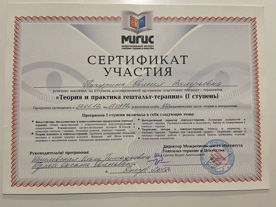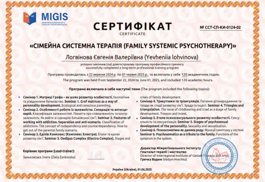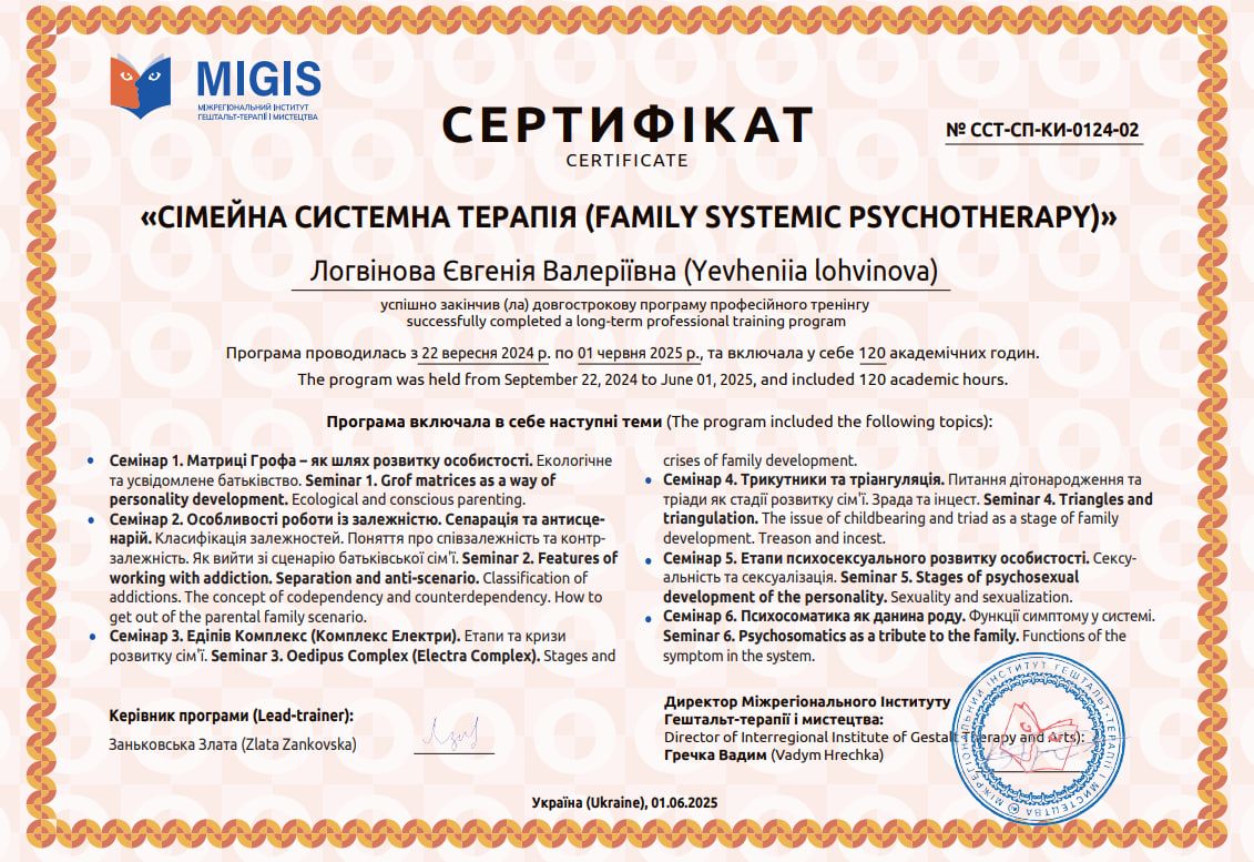 2024 - 2025 - Interregional Institute of Gestalt Therapy and Art (MIGIS), specialized program “Family Systemic Psychotherapy”. Program led by Z.Zankovska. Certificate №ССТ-СП-КИ-0124-02.