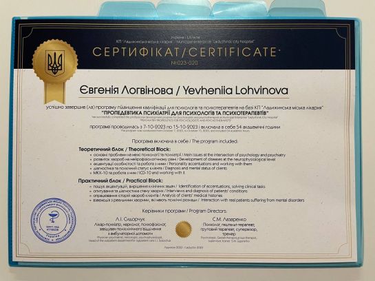 2023 - Municipal Enterprise “Ladyzhyn City Hospital”, advanced training program “Propaedeutics of Psychiatry for Psychologists and Psychotherapists”. Presenter L.Sydorchuk, S.Lazarenko. Certificate №023-020.