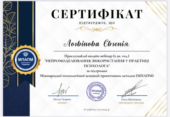 17.01.2024 - International Psychological Association of Projective Techniques, online webinar “Neuromodeling. Use in the practice of a psychologist”. Presenter Natalia Chupryna.