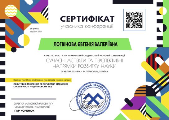 25.04.2025 - International Student Scientific Conference “Modern aspects and promising directions of science development”. Certificate №94061.