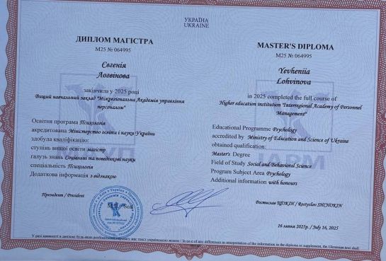 2023 – 2025 – Interregional Academy of Personnel Management, specialty psychology. Diploma M25 №064995.