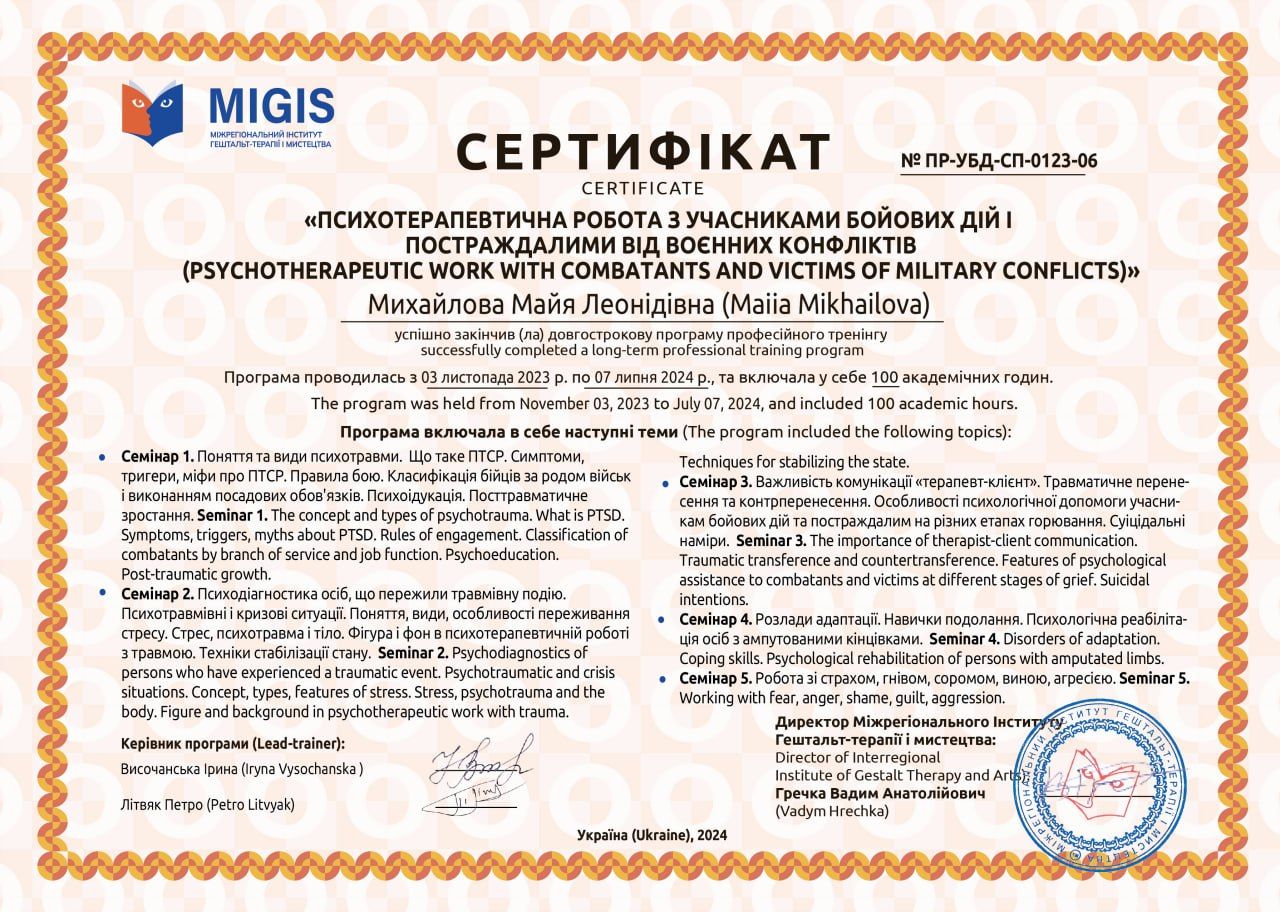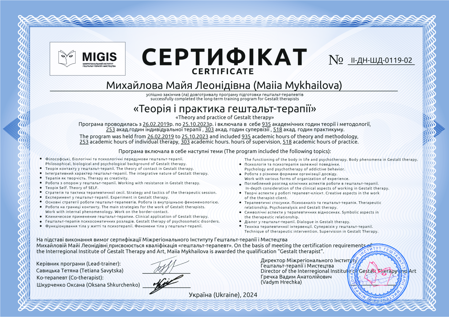 Psychologist | Certified Gestalt Therapist | Trainee Supervisor | Group Therapist | Accredited Assistant of MIGIS | Specialized in working with children and parents in a Gestalt approach | Specializes in psychotherapeutic work with combatants and victims of military conflicts, work with PTSD