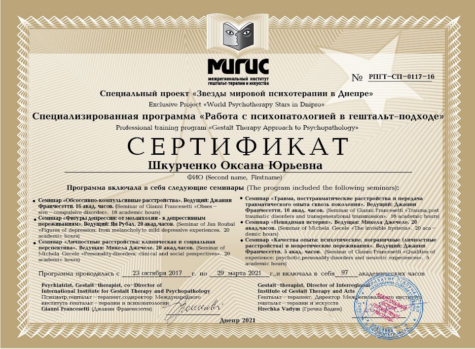 2007 – 2013 – Interregional Institute of Gestalt Therapy and Art (MIGIS) “Theory and Practice of Gestalt Therapy” (1, 2 Stages). Program led by Hrechka V. Certificate № II-ДН-0108-02.