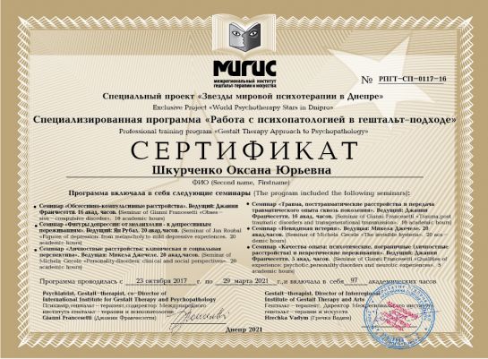 2015 – 2017 – Interregional Institute of Gestalt Therapy and Art (MIGIS), “Improvement in Gestalt Therapy” (3 Stage). Program led by Hrechka V. Certificate III-ДН-0114-06.