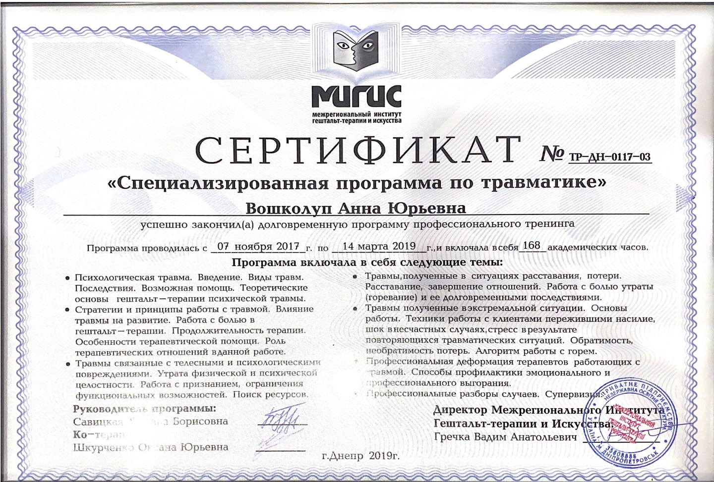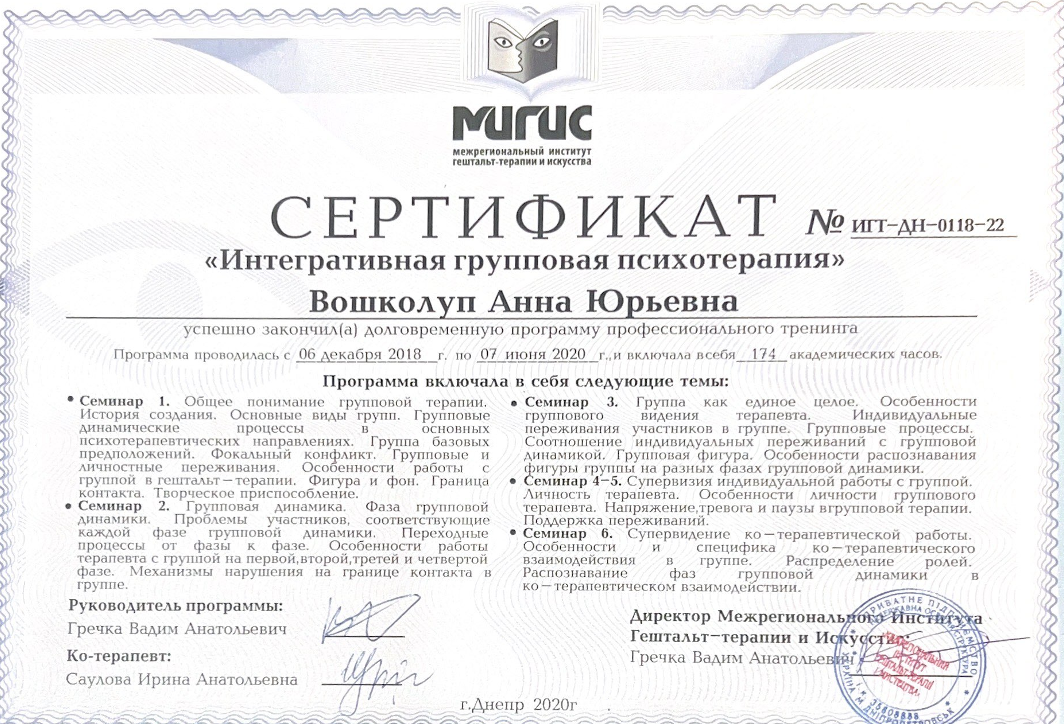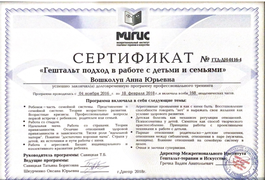 Psychologist | Certified Gestalt therapist | Certified Supervisor | Group therapist | Accredited Senior trainer of MIGIS | Specializes in working with children and parents in the Gestalt approach | Specializes in working with psychological (emotional) traumas | Uses art therapy in work | Uses body-oriented therapy in work