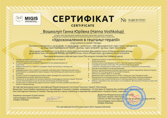 Certified Gestalt therapist and Supervisor