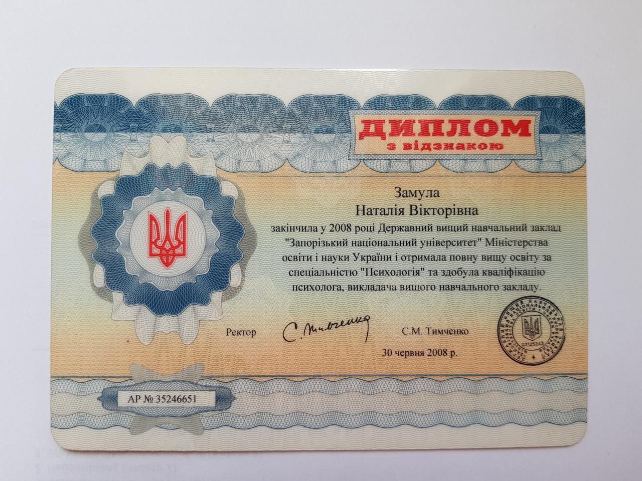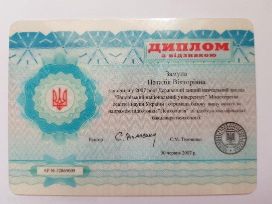 2007 - 2008 - Zaporizhia National University, Master's degree in psychology and teacher of psychology. Diploma AR №35246651.