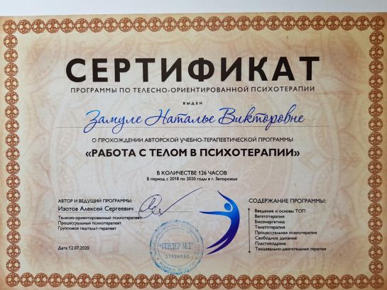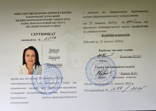 2024 - 2025 - Zaporizhia State Medical University, specialty clinical psychology. Certificate №2536.