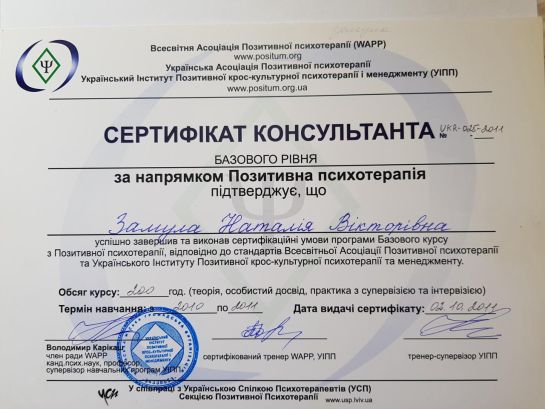 2010 – 2011 – World Association for Positive Psychotherapy (WAPP), Positive Psychotherapy program. Program under the direction of V. Karikash.