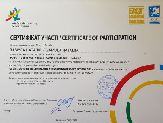 2019 - 2021 - KSU, specialized program "Working with children and adolescents in the Gestalt approach". Program under the direction of A. Titarenko.