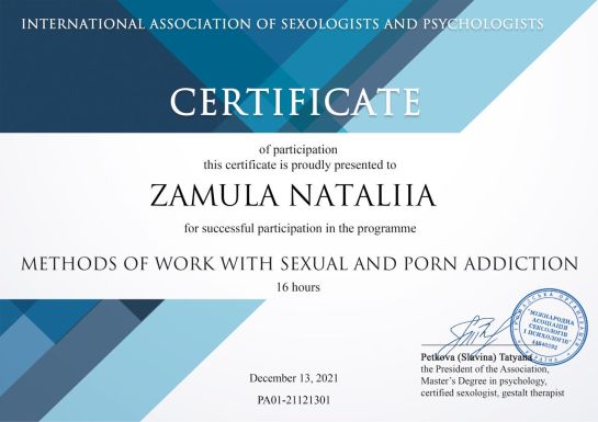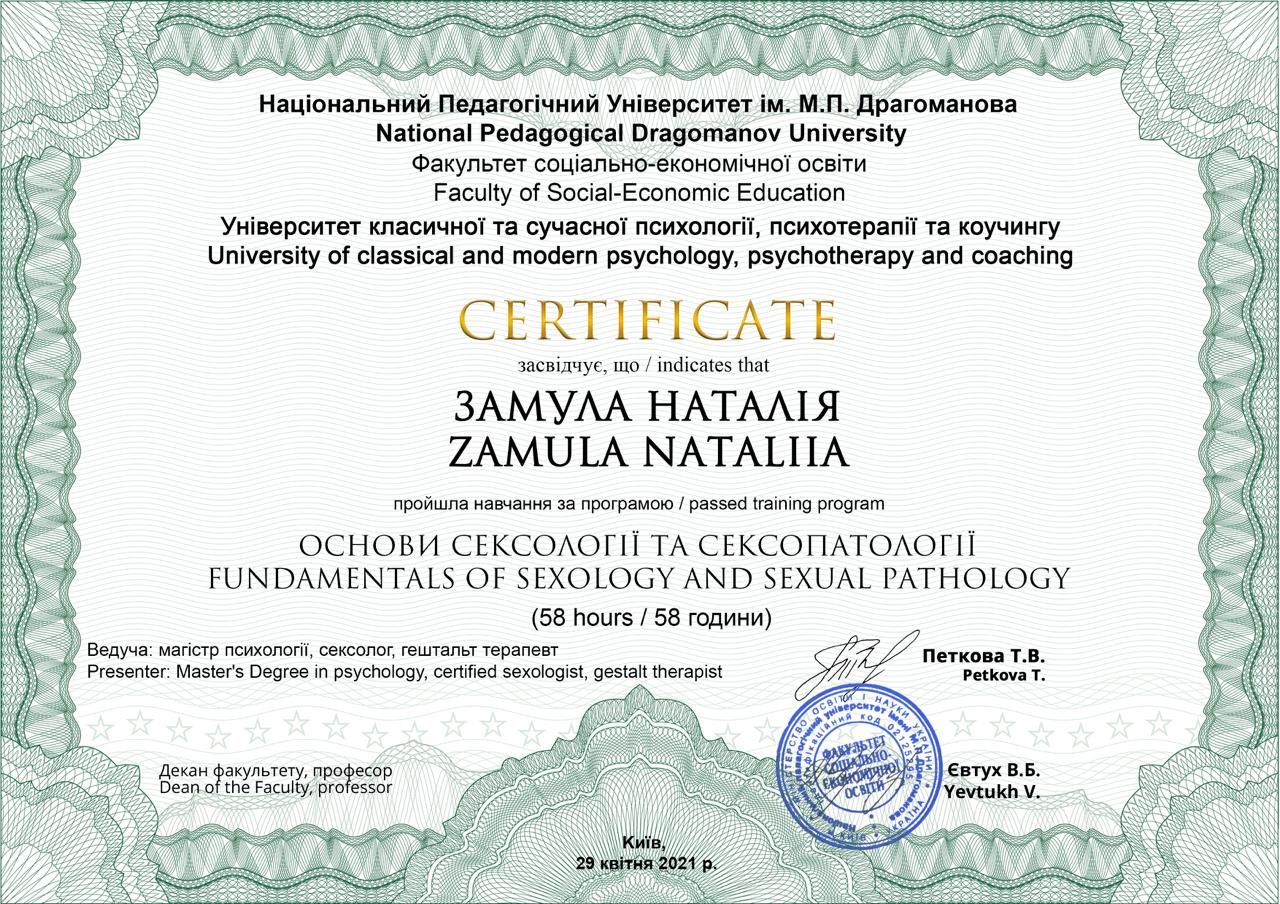 2021 - Dragomanov University, specialized program "Fundamentals of sexology and sexopathology". Program under the direction of T. Slavin (Petkov).