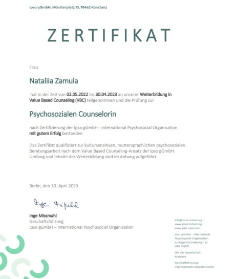 2022 - 2023 - International Psychosocial Organisation, program "Value-Based Counseling". Program led by Inge Missmahl. 1920 hours.