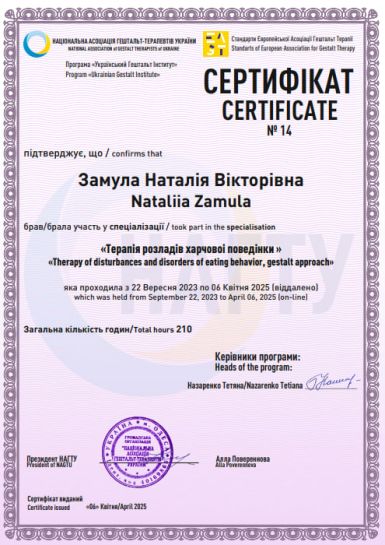 2023 – 2025 - NASTU, specialized program "Therapy of eating disorders". Program under the direction of T. Nazarenko.
