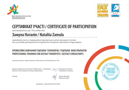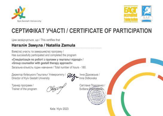 2021 - 2023 - KSU, specialized program "Specialization in working with groups in the Gestalt approach". Program under the direction of S. Pokhodenko.