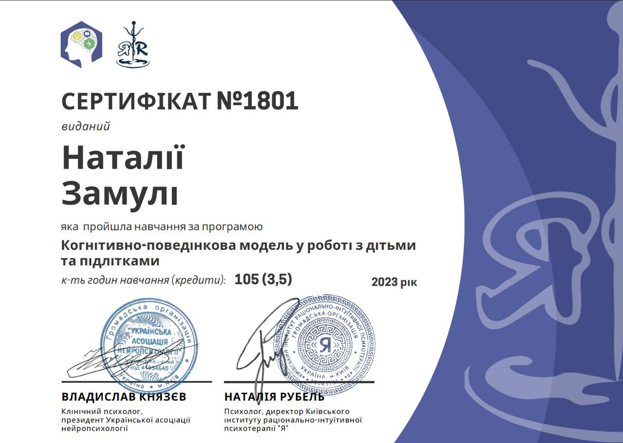 2023 - Kiev Institute of Rational-Intuitive Psychotherapy "I", specialized program "Cognitive-behavioral model in working with children and adolescents". Program under the direction of N. Rubel.