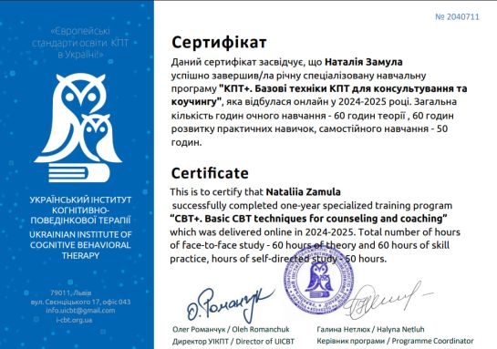 2024 – 2025 – Ukrainian Institute of Cognitive-Behavioral Psychotherapy, CBT+ Program, Basic CBT techniques for counseling and coaching Program under the direction of U. Krok, L. Kryskiv 2040711.