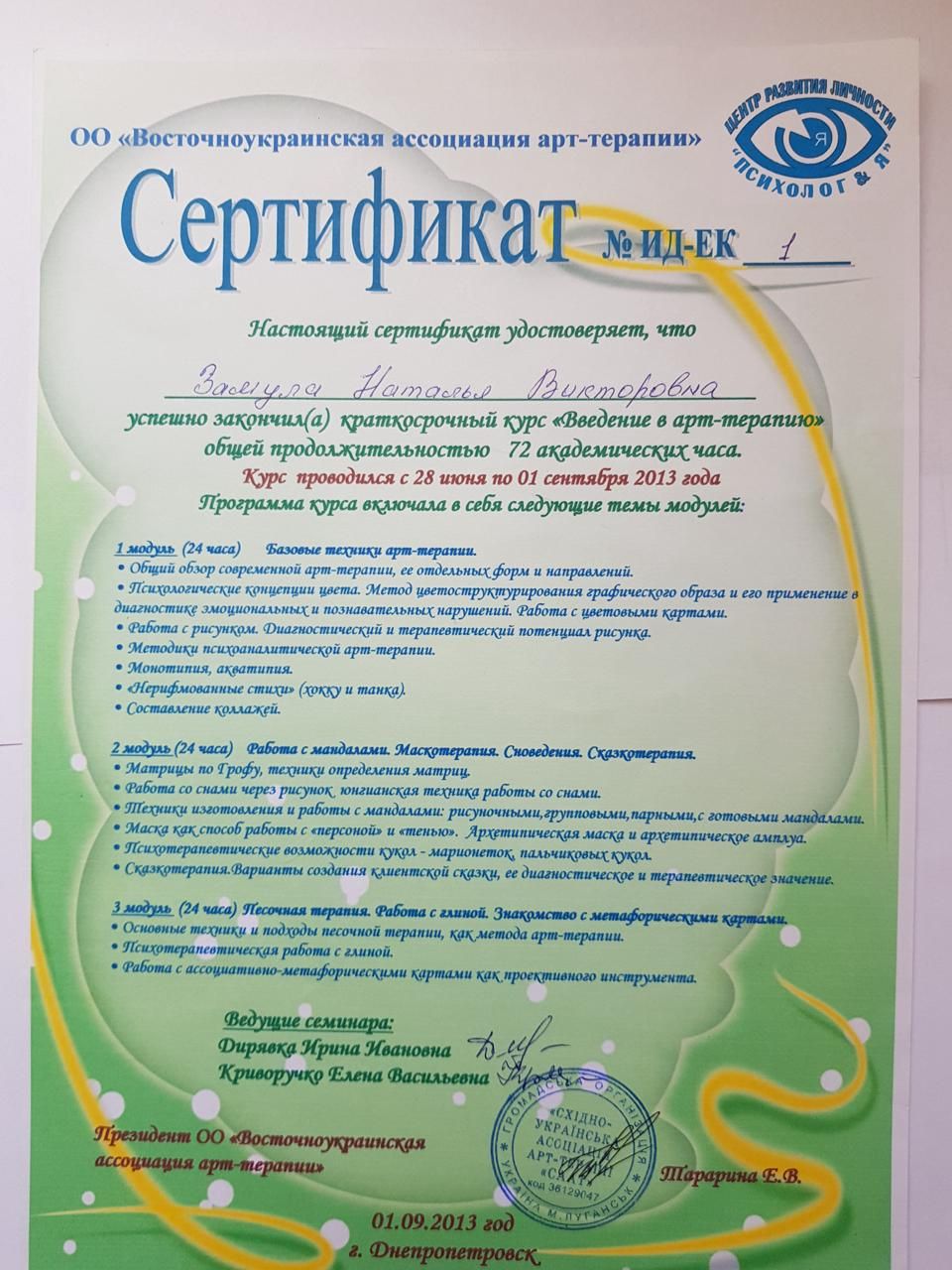 2013 - East Ukrainian Association of Art Therapy, specialized program in Art Therapy. Program under the direction of I.I. Dyryavko, A. Krivoruchko.
