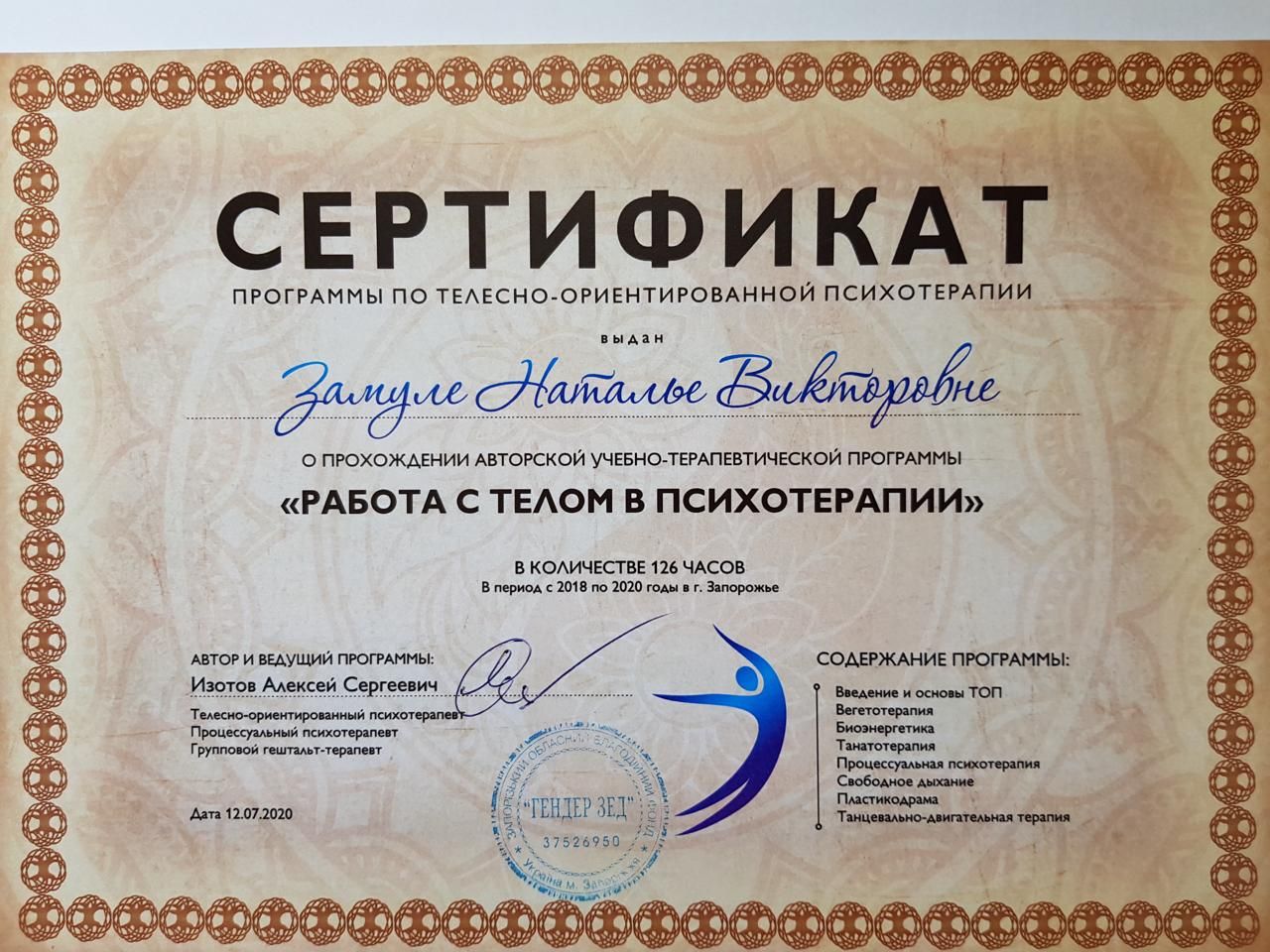 2018 - 2020 Charitable Foundation "Gender VED". Educational and therapeutic program "Working with the body in psychotherapy". Program under the direction of A. Izotov.