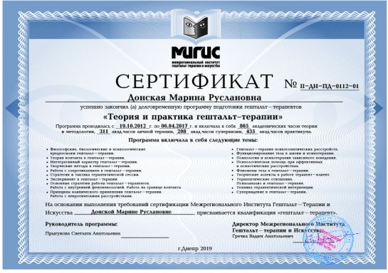 2016 – 2020 рр. – Міжрегіональний інститут гештальт-терапії та мистецтва (MIGIS), «Удосконалення в гештальт-терапії» (ІІІ ступінь). Програма під керівництвом Гречки В. Сертифікат ІІІ-ДН-0116-08.