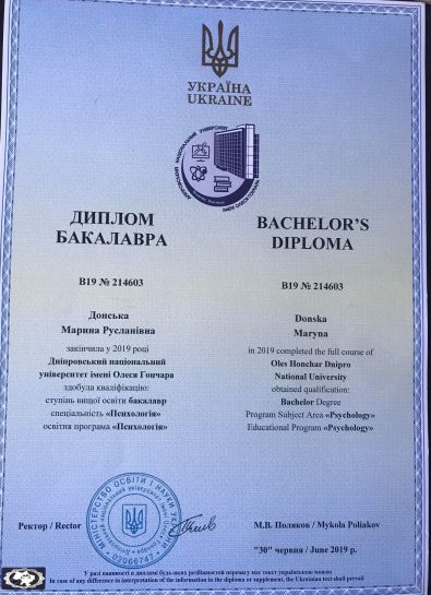 2016 – 2019 рр. – Дніпропетровський національний університет, факультет психології, психолог.