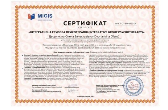 2022-2023рр. – Міжрегіональний Інститут гештальт-терапії та мистецтва (MIGIS), спеціалізована програма "Інтегративна групова психотерапія". Програма під керівництвом Гречки В.А. Сертифікат № ІГТ-СП-ВН 0122-04.