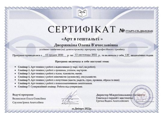 2020-2022рр. – Міжрегіональний Інститут гештальт-терапії та мистецтва (MIGIS), спеціалізована програма "Арт в гештальт терапії" Програма під керівництвом Саулової І.А. та Великожон О.О. Сертифікат №ГTAРТ-СП-ДН 01.20.02.