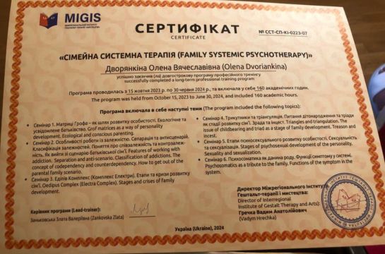 2023-2024рр. – Міжрегіональний Інститут гештальт-терапії та мистецтва (MIGIS), спеціалізована програма "Сімейна системна терапія". Програма під керівництвом Занковської З.В. Сертифікат №ССТ-СП-КІ-0223-07.