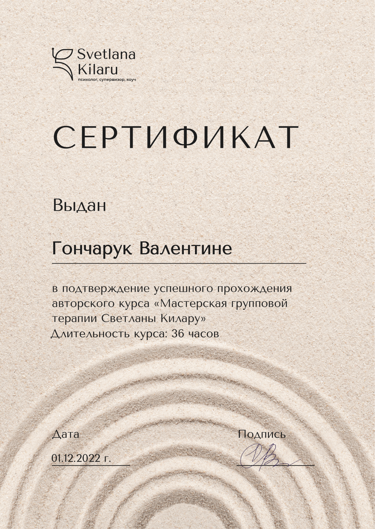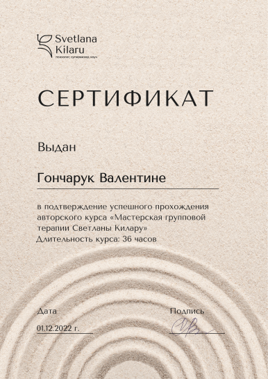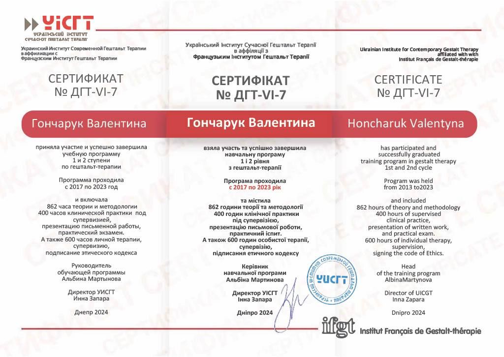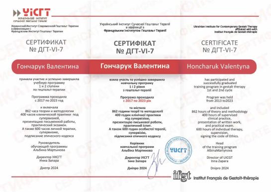 2017 – 2023 рр. – Український інститут сучасної гештальт терапії в аффіляції з Французьким інститутом гештальт терапії (1,2 ступінь). Керівник Мартинова А. Сертифікат № ДГТ-VI-7.