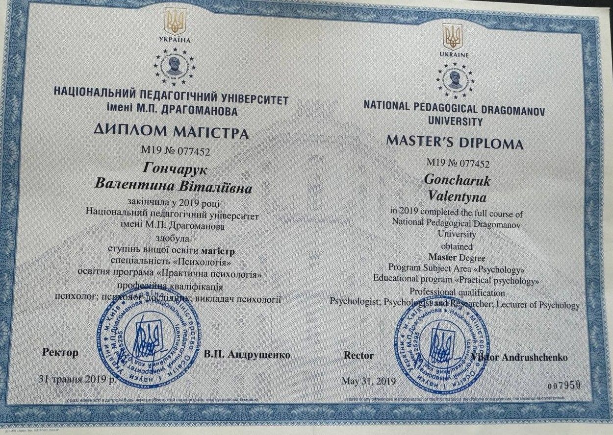 2019 р. – Національний педагогічний університет ім.М.П.Драгоманова, магістр психології. Диплом М19 №077452.