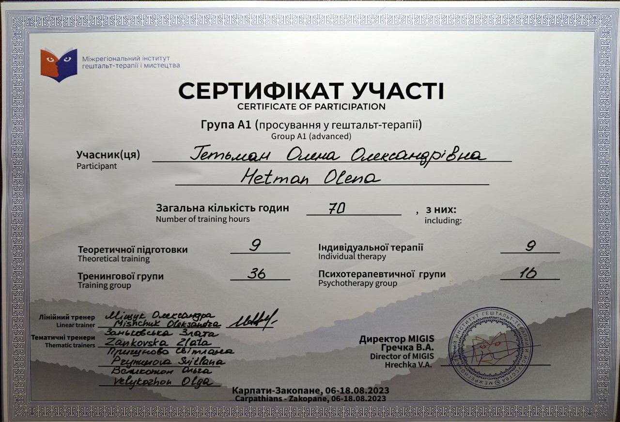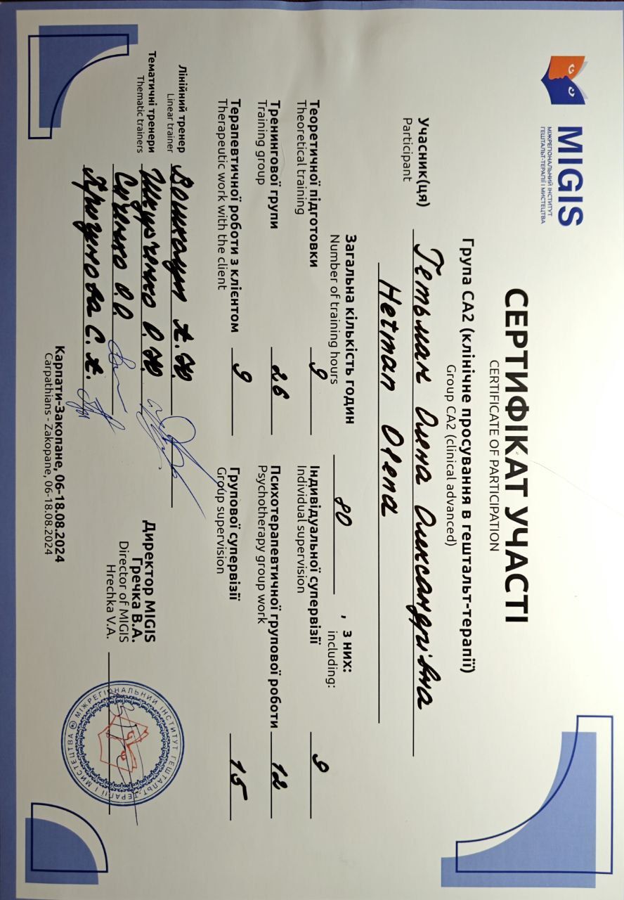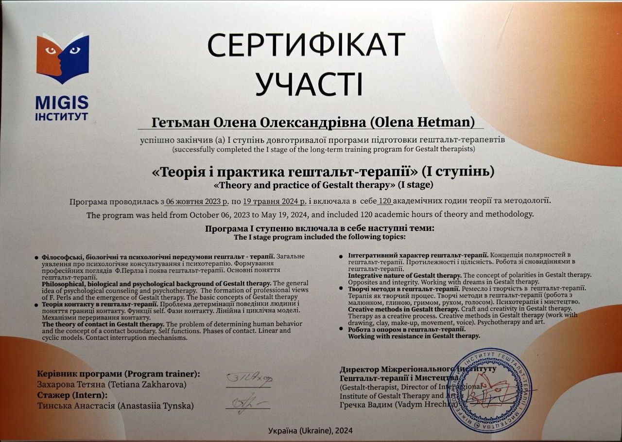 2022 - 2024 рр. - Міжрегіональний інститут гештальт-терапії та мистецтва (MIGIS), «Теорія та практика гештальт-терапії», (I, II ступінь). Програма під керівництвом Захарової Т.