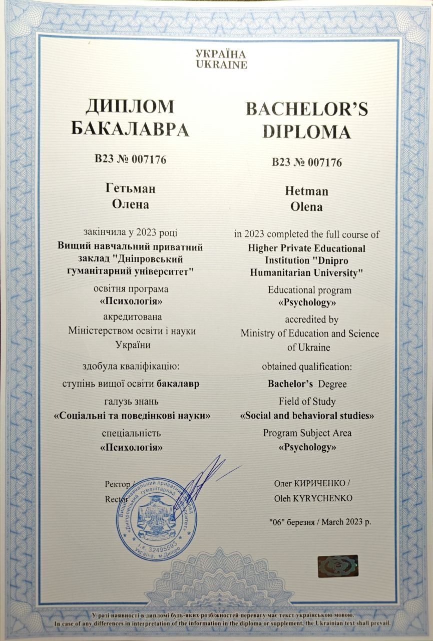 2019 - 2023 рр. - "Дніпровській гуманітарний університет", спеціальність психологія. Диплом В23 №007176