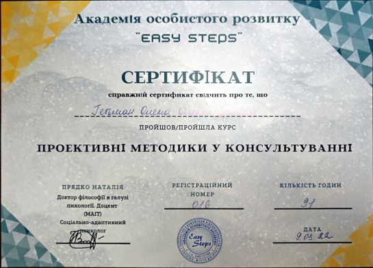 2021 - 2022 рр. - Academy of Personal Development "Easy Steps ", курс «Проективні методики у консультуванні". Ведуча Прядко Н.