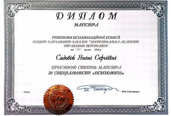2018 - 2020 рр. - Міжрегіональна Академія управління персоналом (МАУП), спеціальність "психологія". Диплом М20 № 106428.