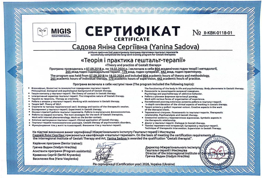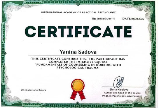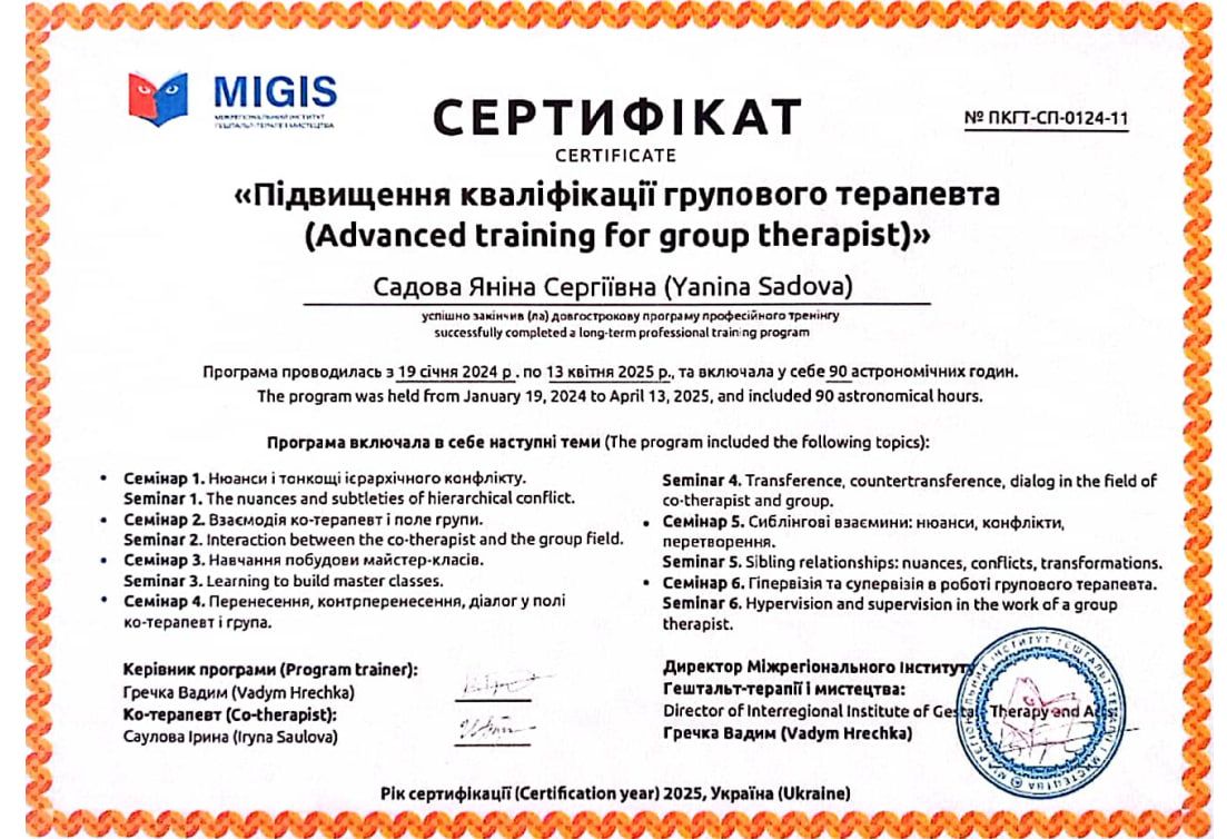 2024 – 2025 рр. - Міжрегіональний інститут гештальт-терапії і мистецтва (MIGIS), «Підвищення кваліфікації групового терапевта». Програма під керівництвом Гречки В. Сертифікат № ПКТ-СП-0124-11.