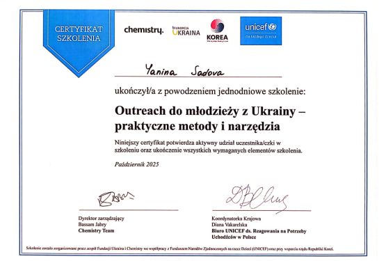 2025 р. - Навчання від команди Фонду «Україна та Хімія» у співпраці з ЮНІСЕФ, «Аутріч-робота з молоддю з України: практичні методи та інструменти».