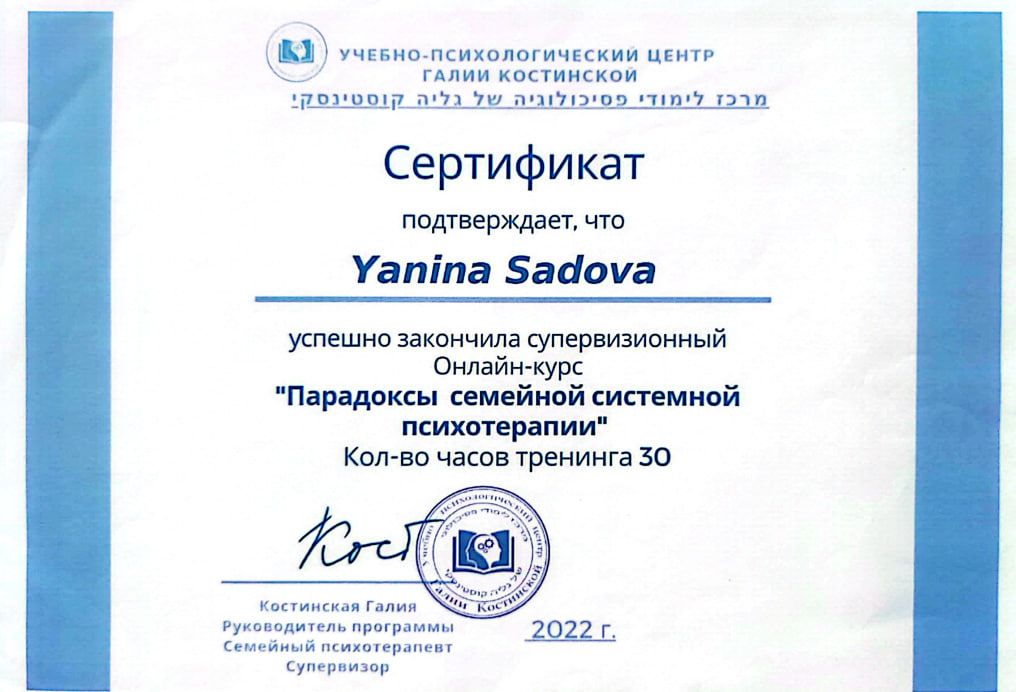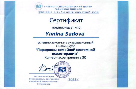 2022 р. - Навчально-психологічний центр Галії Костинської, Ізраїль, курс «Парадокси сімейної системної психотерапії».