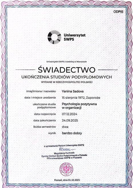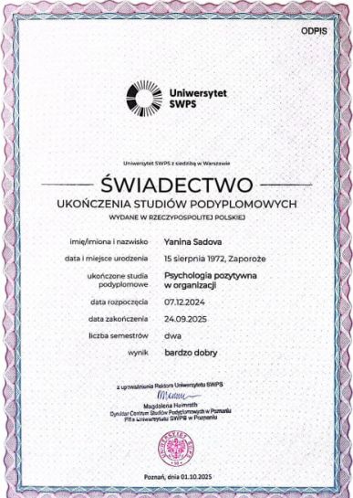 2024 – 2025 р. – SWPS, Університет гуманітарних і соціальних наук, Польща.