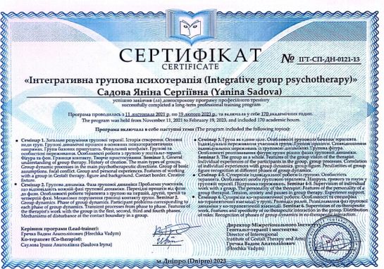 2021 -2023 рр. - Міжрегіональний інститут гештальт-терапії і мистецтва (MIGIS), спеціалізована програма «Інтегративна групова психотерапія». Програма під керівництвом Гречки В. Сертифікат № ІГТ-СП-ДН-0121-13.