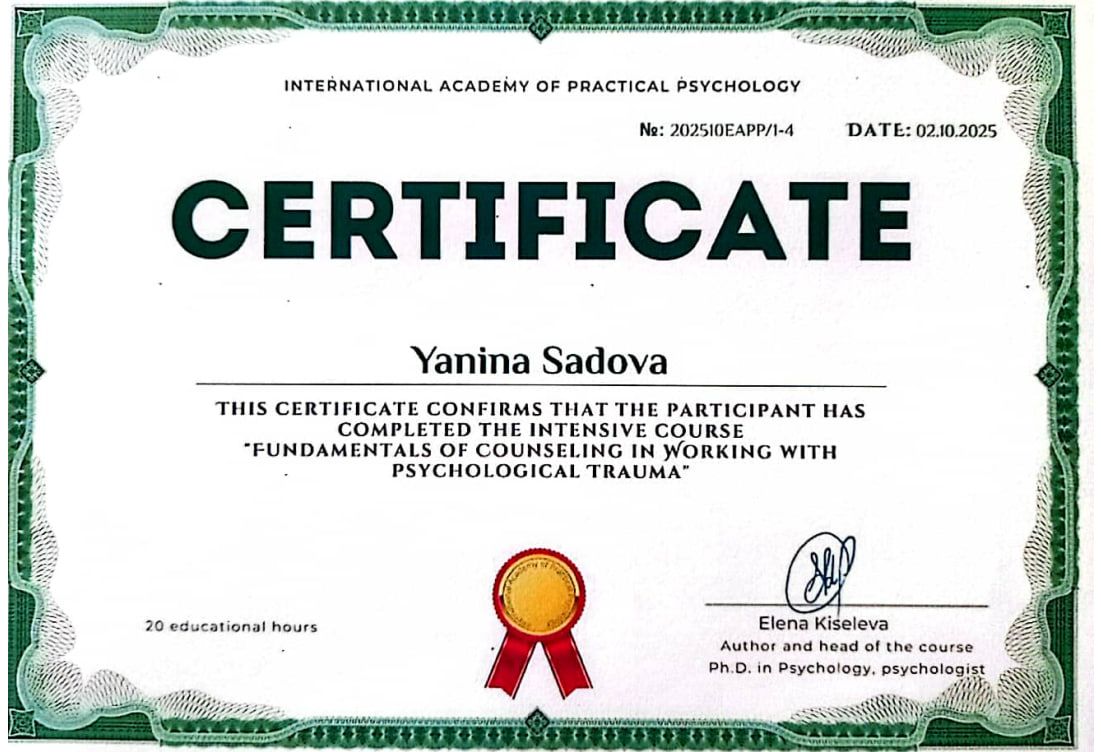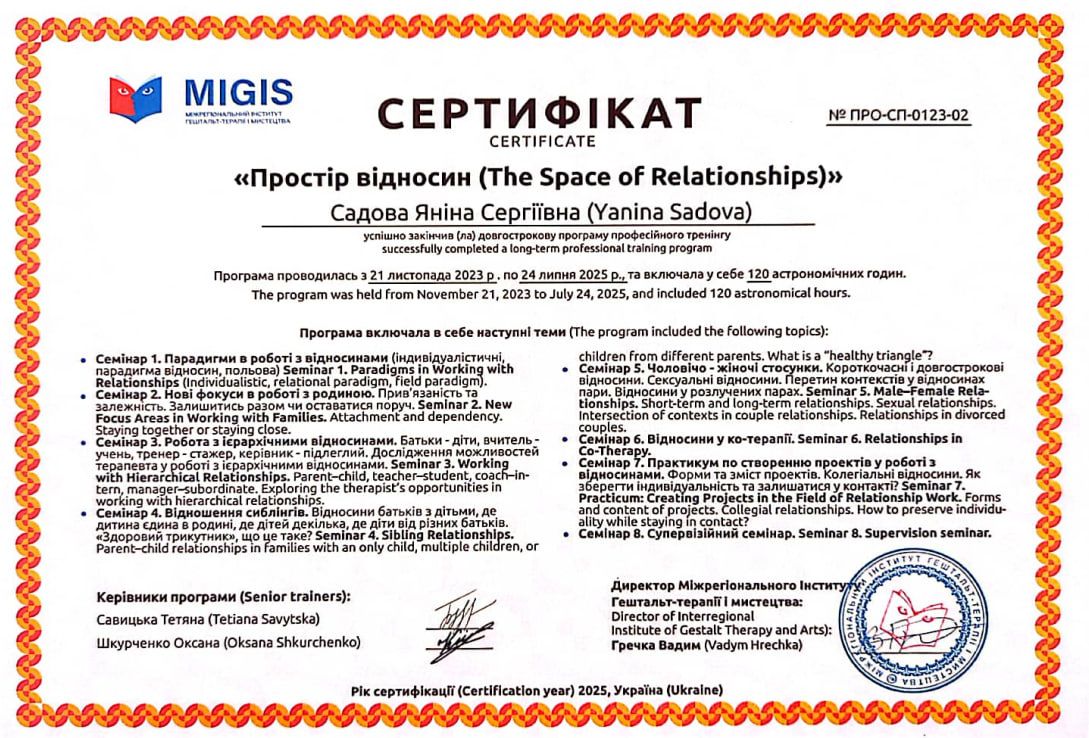 2023 – 2025 рр. - Міжрегіональний інститут гештальт-терапії і мистецтва (MIGIS), спеціалізована програма «Простір відносин». Програма під керівництвом Савицької Т., Шкурченко О. Сертифікат № ПРО-СП-0123-02.