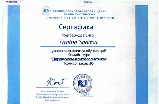 2022 р. - Навчально-психологічний центр Галії Костинської, Ізраїль, курс «Парадокси психосоматики».