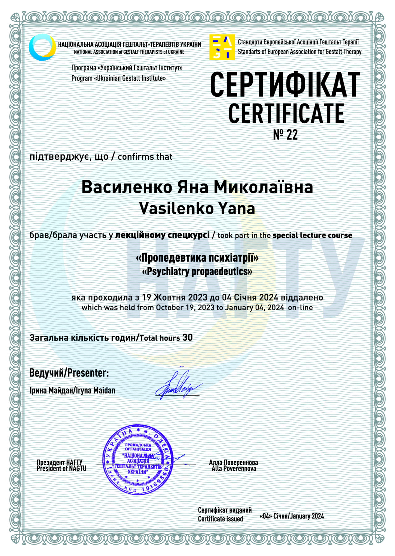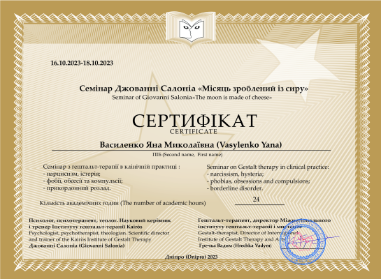 2013 – 2014 рр. – Київський інститут гештальту та психодрами (КДГІП) «Введення в гештальт-терапію, гештальт-консультування. Контакт із собою та з іншими» (1 ступінь), під керівництвом Зозуля Е., сертифікат №8854.
