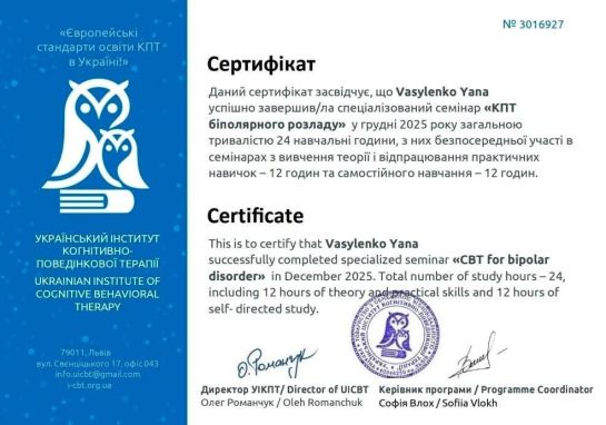 2025 р. - Український інститут когнітивно-поведінкової терапії, спеціалізований семінар «КПТ біполярного розладу». Ведучі Олег Романчук, Софія Влох