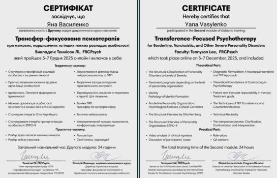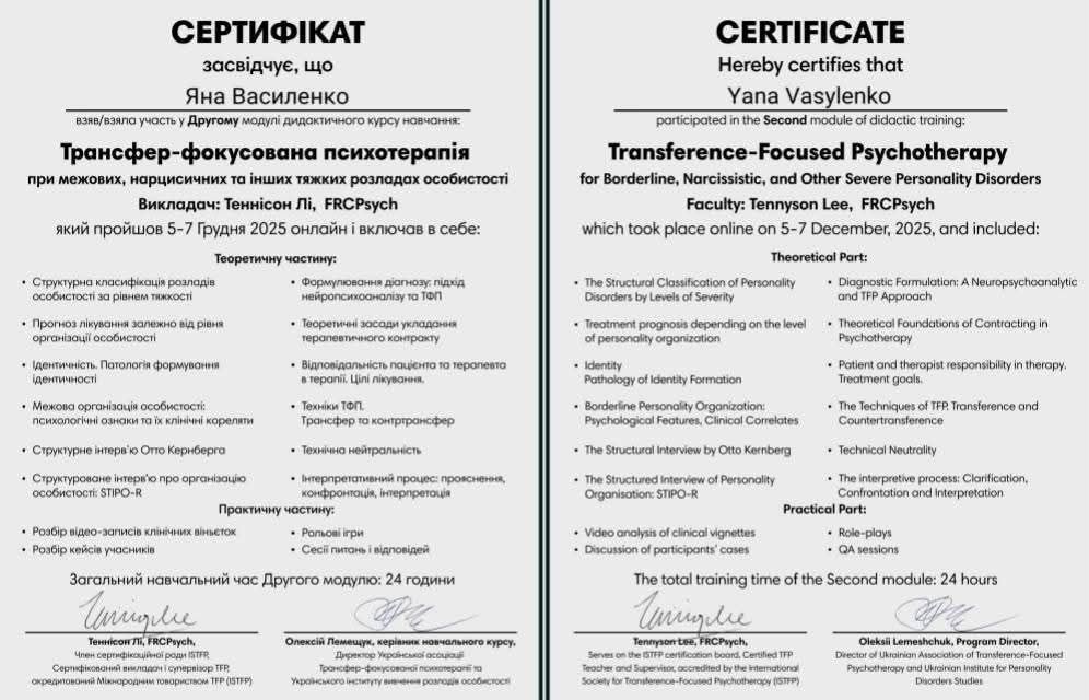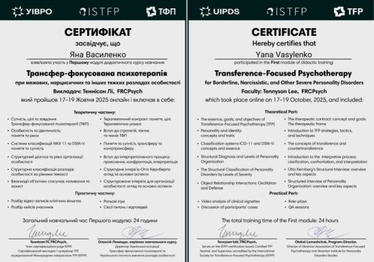 5-7.12.2025 р. - Українська асоціація Трансфер-фокусованої психотерапії, «Трансфер-фокусована психотерапія при межових, нарцисичних та інших тяжких розладах особистості Модуль 2». Ведучий Теннісон Лі.