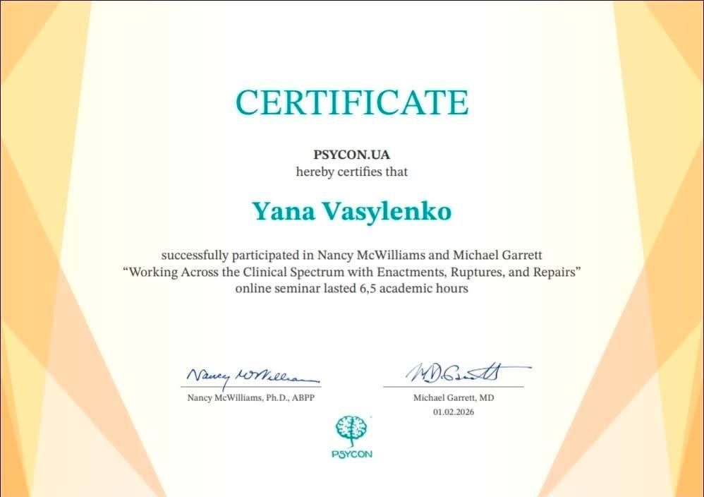 01.02.2026. - PSYCON.UA, онлайн-семінар Ненсі Мак-Вільямс та Майкла Гарретта: «Робота в усьому клінічному спектрі з відреагуванням, розривами та відновленням»