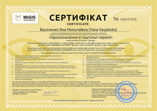 2016 – 2020 рр. – Міжрегіональний інститут гештальт-терапії та мистецтва (MIGIS), «Удосконалення в гештальт-терапії» (3 ступінь). Програма під керівництвом Гречка В. Сертифікат № ІІІ-ДН-0116-09.